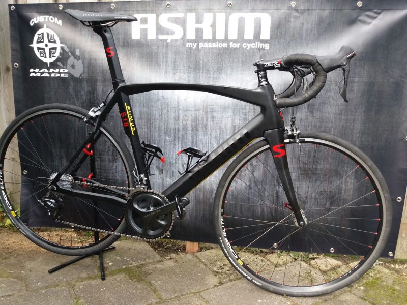 | Info: Askim race. Frame fullcarbon, Rube fullcarbon stuur, hydro leidingen volledig geïntegreerd. Groepset (optioneel) Shimano 105 Di2 12 sp R7100. Wielen RUBE FCA50 Tubeless, naven (optioneel) DT Swiss 240. Ontwerp/design custom paint. |
